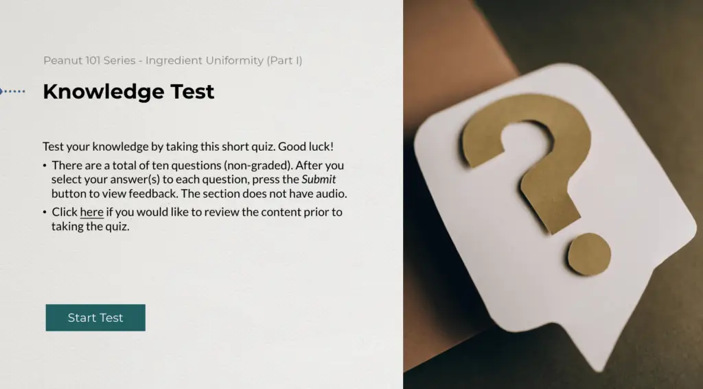 Join us for the latest edition of our Peanut 101 eLearning series. In this course, our spotlight turns to the crucial aspect of ingredient uniformity, exploring its direct impact on food safety and the performance of food products. After the completion of this course, you will gain a deeper understanding of peanut growth and physiology through a comprehensive perspective on this essential topic.