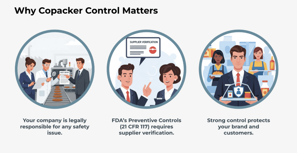 Partnering with a food copacker does not transfer legal responsibility for food safety or regulatory compliance. Under 21 CFR 117, brand owners remain accountable for approving, verifying, and documenting copacker performance within their supplier approval program.